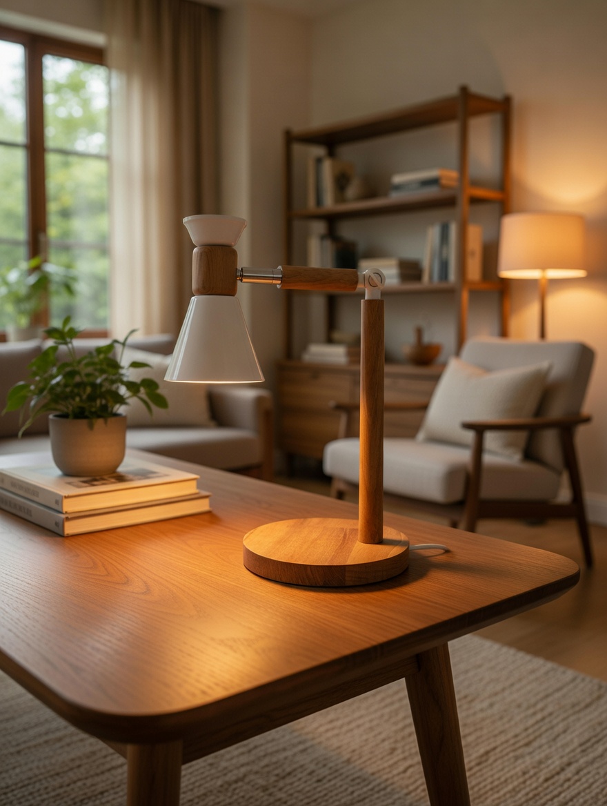 Doğal ahşap gövdesi ve zarif beyaz başlıklarıyla hem modern hem de sıcak bir ambiyans yaratan bu masa lambası, her tarza uyum sağlar.